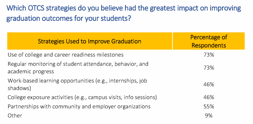 - 73% of respondents reported the greatest impact was the use of the National Milestones to improve college and career readiness